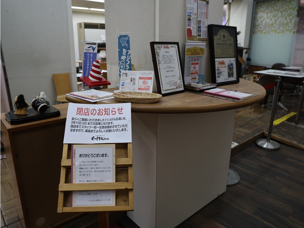 アニメ聖地認定証やスタンプ、閉店のお知らせ。