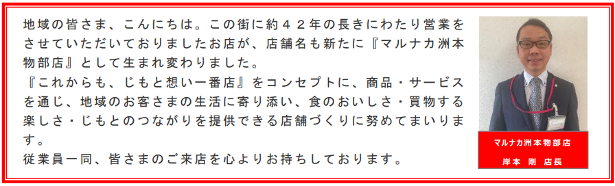 フジはリベラルからの事業承継について触れたうえで「洲本市物部で歩んできた42年の地元への想いを新しい時代へとつなげ、これからの10年、20年先もお客さまに必要とされる店舗を目指してまいります。」としている。