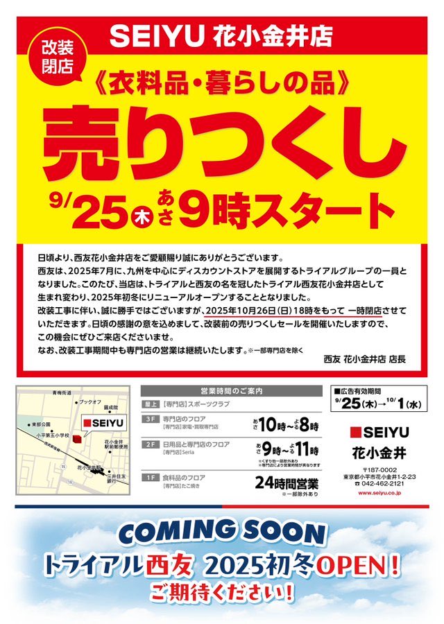 東京都小平市にあるトライアルHD系の総合スーパー「西友花小金井店」が2025年10月26日に一旦閉店し、11月28日に「トライアル西友花小金井店」としてリニューアル開業する。