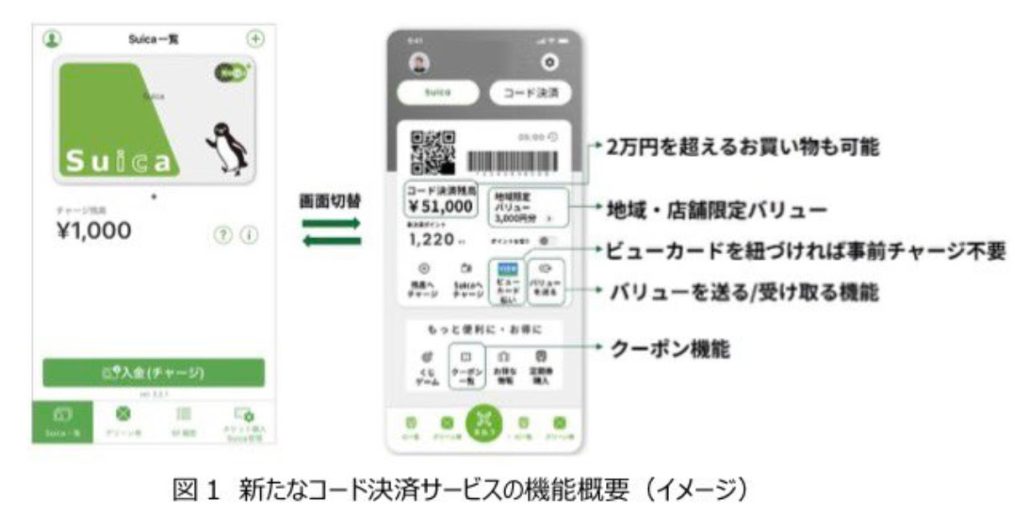 モバイルSuicaリニューアル・コード決済のイメージ。