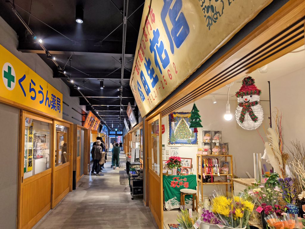 11月時点でこの駅市場の高架下部分には期間限定店舗を含めて11店が出店。そのうち「野田商店」「丸栄鮮魚店」「松田生花店」「安部かき店」「高橋商店」「味一匠」「くらうん薬局」の7店はリニューアル前からある店舗。(このほか以前からある「ヒラオペット」が2期開業時に再入居予定)