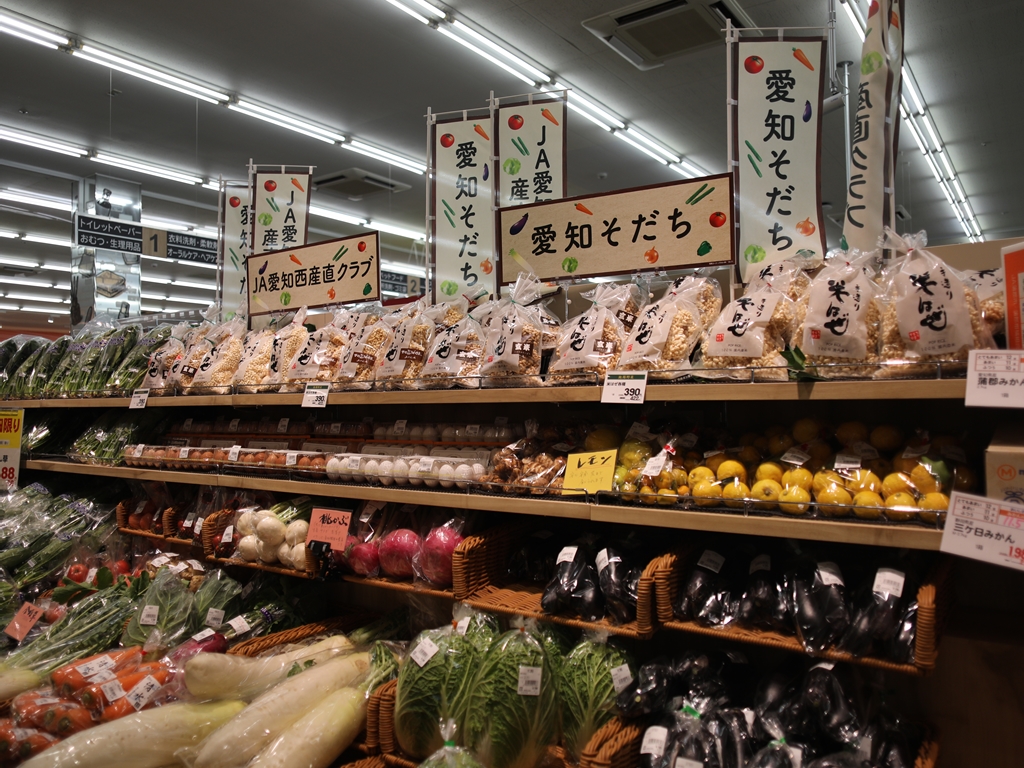 青果では農協系「JA愛知西産直クラブ」「愛知そだち」地場野菜コーナーや店内フルーツ使用「くだものやのカットフルーツ&デザート」コーナーを展開、お値打ち商品「店長厳選得価品」による価格訴求を行う。