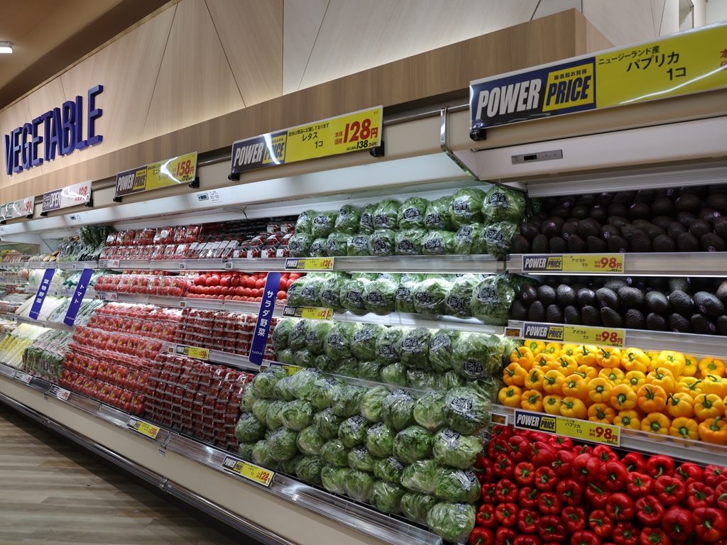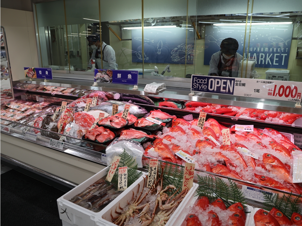 生鮮食品のうち、青果は厳選した市場直送の「消費頻度の高い野菜」やバイキング形式のカットフルーツコーナーを展開、鮮魚は小規模店舗ながら対面販売方式を採用したうえで食事シーンや時間帯に応じた寿司や魚種を提供する。