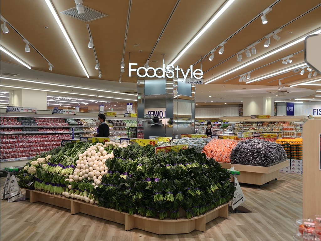 フードスタイル三田店は「価値提案型スーパーマーケット」「Food Style from AEON(フードスタイル)」として、コンセプトに「鮮度、活気、楽しさ、安さを感じる店づくり」を掲げ、ファミリー層や共働き世帯を意識した商品・サービス・売場環境を提供。見栄えや売上改善を目的に従来型業態と比べて店舗取扱商品数を2割程度削減し、価格やライブ感の訴求をめざす。
